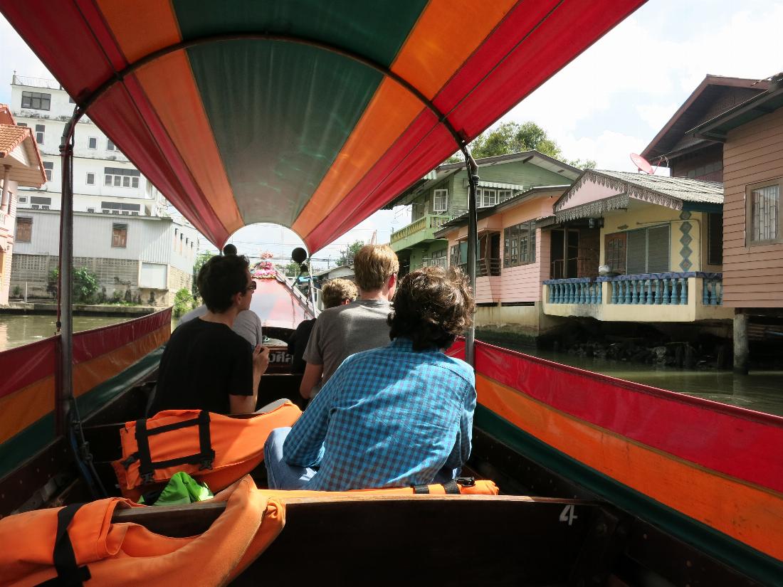 Trotz der langen Reise kamen wir aber alle erstaunlich gut mit dem Jetlag zurecht. Deshalb konnten wir auch am nächsten Tag vom reichhaltigen Frühstück – das auch genauso gut ein Mittagessen hätte sein können – gestärkt direkt in den Großstadtdschungel der Millionenmetropole aufbrechen! Dies ist allerdings leichter gesagt als getan. Denn Temperaturen von über 30°C und eine Luftfeuchtigkeit nahe der Sättigung, sind nicht gerade das, was man aus dem mitteleuropäischem November gewohnt ist. Geschweige denn sind sie einladend zu kilometerlangen Spaziergängen durch die Straßen. Daher wählten wir den entspannteren Weg und ließen uns erst einmal in einem Langschwanzboot auf einer Tour durch die Wasserstraßen der Stadt fahren. Dessen Ende war auch der Beginn einer tollen Wat(t)wanderung! Wat ist der thailändische Begriff für Tempel, und davon gibt es in Bangkok wie in ganz Thailand jede Menge und jeder einzelne ist ein faszinierendes Bauwerk mit einer interessanten Geschichte und/oder Architektur. Auf dem Weg durch die Tempel und Sehenswürdigkeiten begegnete uns auch mit den Mealworms gleich ein weiteres WRO-Team aus Deutschland, das, wie sich herausstellen sollte, sogar im selben Hotel wohnte – wie klein die Welt doch ist! Aber so interessant die Stadt auch ist, irgendwann war jeder von uns auch körperlich am Ende und freute sich darauf, vom Pool auf dem Hoteldach aus den Sonnenuntergang beobachten zu können.