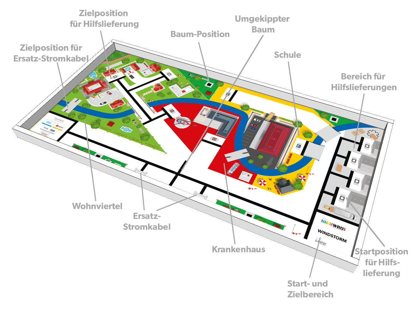 Ein Dorf wurde von einem schweren Sturm getroffen. Der Strom ist ausgefallen und die Hauptstraße wird von einem umgefallenen Baum blockiert. In bestimmten Bereichen im Dorf werden Hilfslieferungen benötigt. Eure Hilfe wird gebraucht!